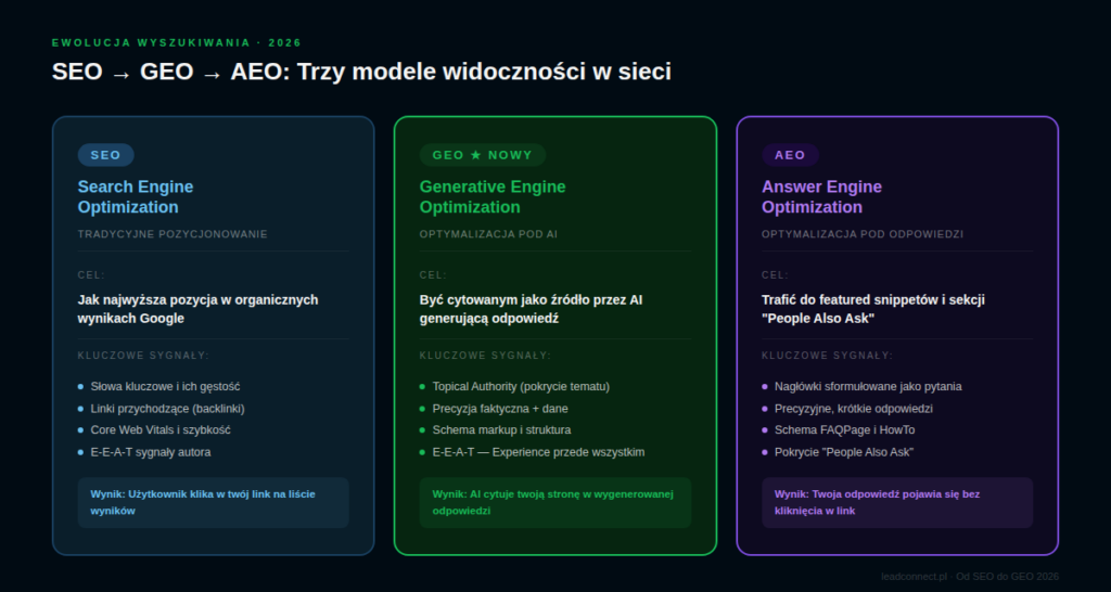 SEO (Search Engine Optimization) — tradycyjne pozycjonowanie w Google. Cel: być wysoko na liście wyników wyszukiwania. Nadal ważne — ale przestaje być wystarczające.