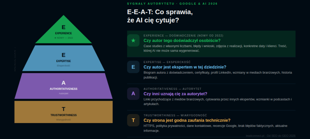 Sygnały E-E-A-T. Google i AI premiują treści z sygnałami doświadczenia, eksperckości, autorytetu i wiarygodności. W praktyce oznacza to: podpisany autor z biogramem, cytowania w mediach branżowych, linki z wiarygodnych źródeł, aktualne i weryfikowalne informacje.