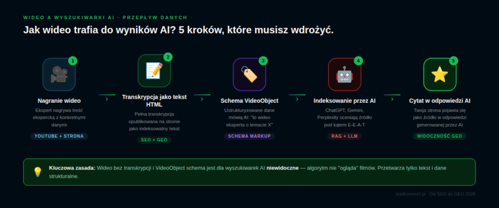 - Wideo bez transkrypcji i schema VideoObject jest dla AI niewidoczne