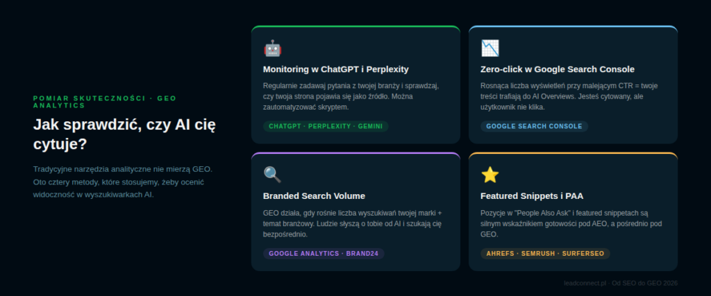 Sprawdzaj ręcznie w ChatGPT i Perplexity. Wpisuj pytania, które zadają twoi klienci przed zakupem, i obserwuj czy twoja strona pojawia się jako źródło. Rób to raz w miesiącu. Jeśli konkurencja jest cytowana, a ty nie — wiesz gdzie jest problem.