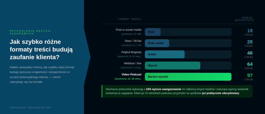 Badania pokazują, że słuchacze podcastów wykazują o 24% wyższe zaangażowanie niż użytkownicy innych mediów i mają znacząco wyższy wskaźnik konwersji na zapytanie. W środowiskach B2B, gdzie decyzja zakupowa jest dłuższa i drożej opłacona, ten efekt jest jeszcze silniejszy.