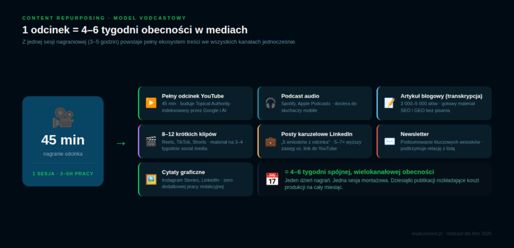 Model vodcastowy nie polega na codziennym tworzeniu. Polega na jednym nagraniu, które funkcjonuje przez cały miesiąc w wielu miejscach jednocześnie. Nazywa się to content repurposing — ponowne wykorzystanie jednego materiału źródłowego w wielu formatach i kanałach.