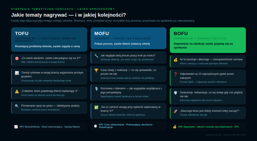 Twój vodcast odpowiada na te lęki. Nie reklamuje — edukuje i rozwiewa. I właśnie przez to zamienia słuchaczy w klientów.