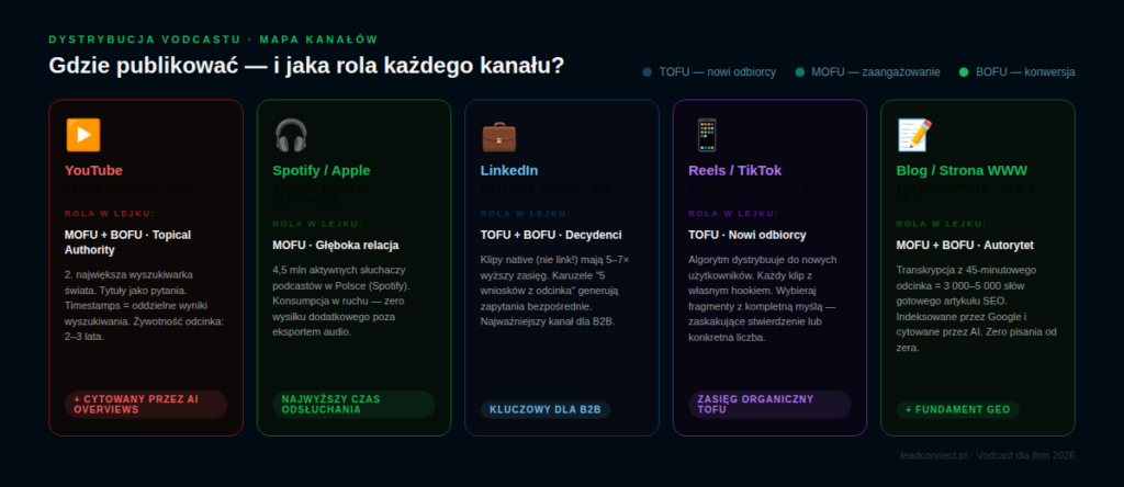 Nagranie odcinka to dopiero połowa pracy. Druga połowa to dystrybucja — i tu większość twórców popełnia ten sam błąd: wrzucają materiał w jedno miejsce i czekają.