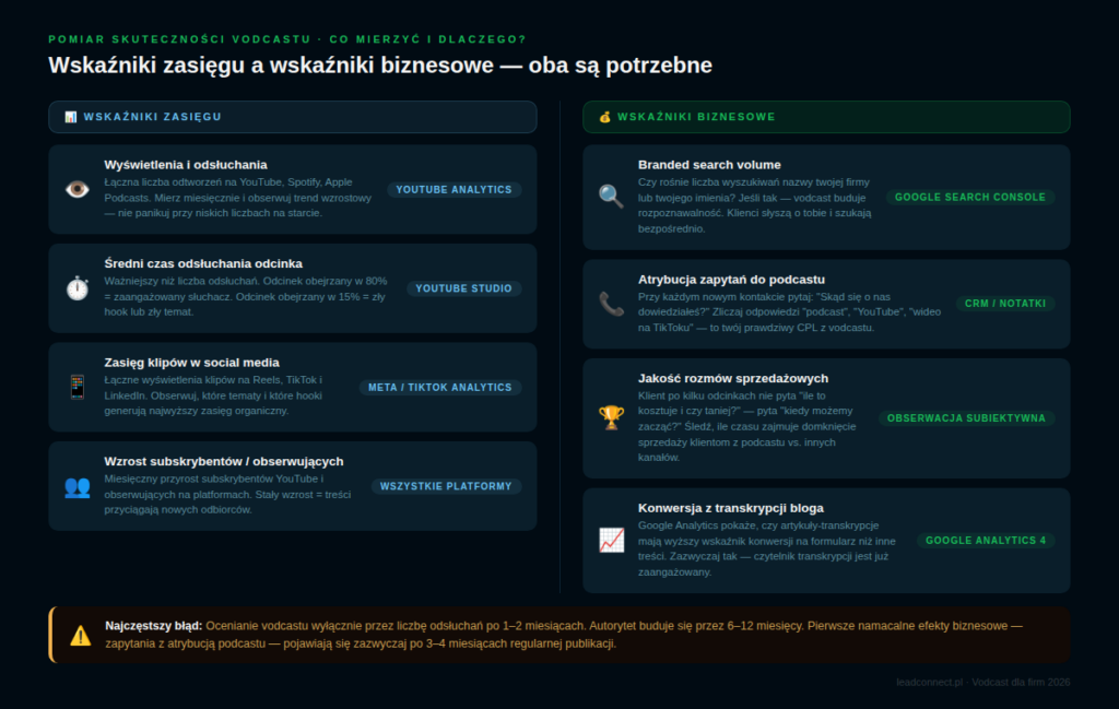 Błąd większości twórców podcastów: mierzą liczbę odsłuchań i zatrzymują się. Liczba odsłuchań to wskaźnik zasięgu — nie wskaźnik biznesowy.