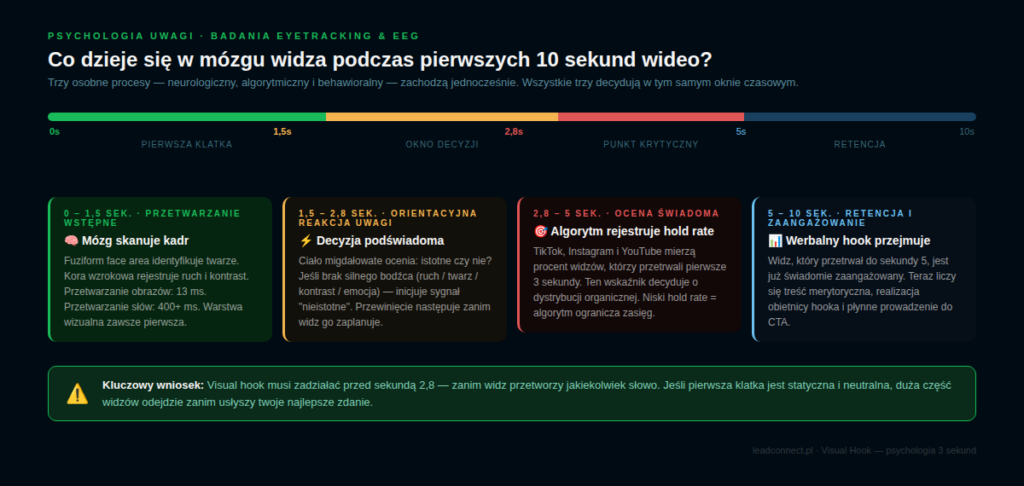 Badania z użyciem eyetrackingu i EEG przeprowadzone na użytkownikach TikToka i Instagrama pokazują, że pierwsza aktywna ocena treści wideo następuje między 1,5 a 2,8 sekundy od pojawienia się pierwszej klatki. Jeśli w tym oknie nie pojawi się wystarczająco silny bodziec — mózg klasyfikuje treść jako nieistotną i inicjuje przewinięcie. Dosłownie — zanim użytkownik zdąży pomyśleć.