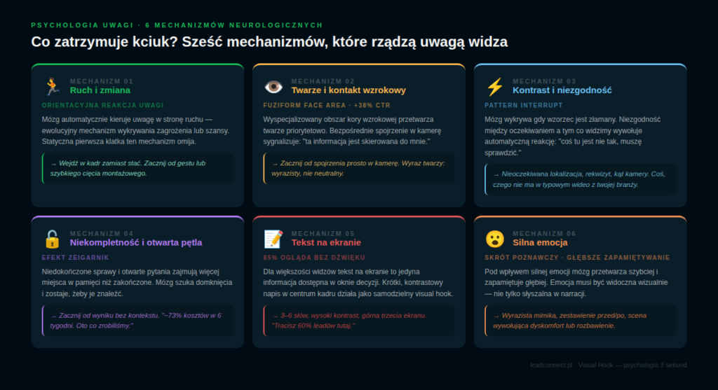 - Który z 6 mechanizmów aktywuje ten hook? (Ruch / twarz / kontrast / niekompletność / tekst / emocja)