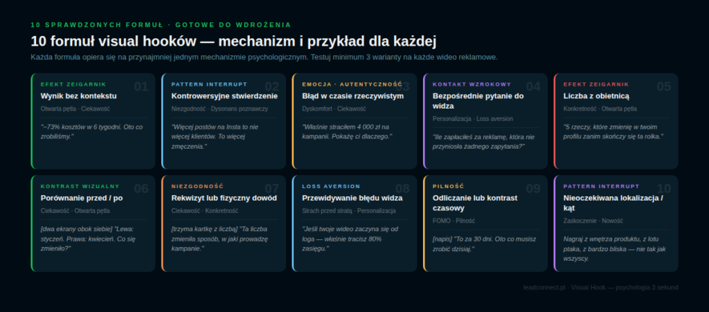 Najlepsze wideo łączą oba typy. Visual hook zatrzymuje kciuk. Werbalny hook utrzymuje uwagę przez kolejne 10–30 sekund.