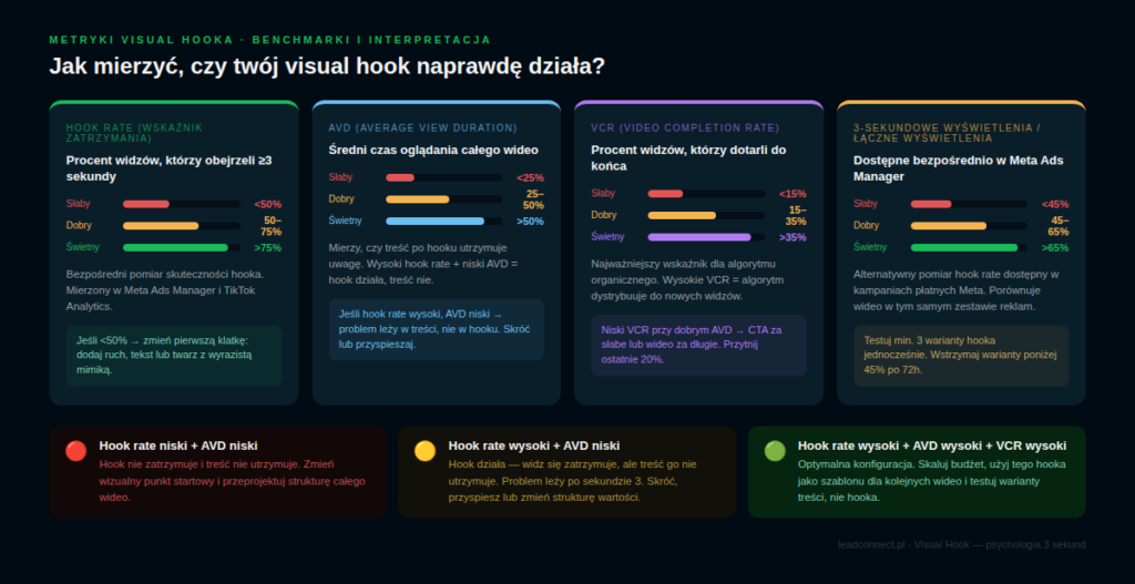 - Hook rate powyżej 60% to dobry wynik; testuj przynajmniej 3 warianty hooka na każde wideo reklamowe
