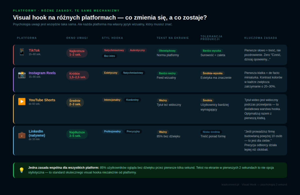 LinkedIn (wideo natywne): Najdłuższe okno uwagi z wszystkich platform społecznościowych — użytkownicy LinkedIn są nastawieni na konsumpcję treści profesjonalnych. Hook może być mniej agresywny, ale musi być bardzo precyzyjnie skierowany do konkretnej grupy zawodowej. „Jeśli prowadzisz firmę budowlaną powyżej 10 pracowników — to jest dla ciebie” zatrzyma więcej właściwych osób niż jakikolwiek clickbait.